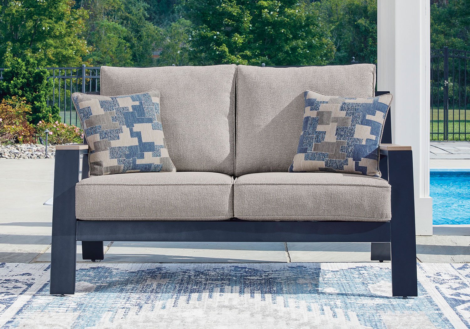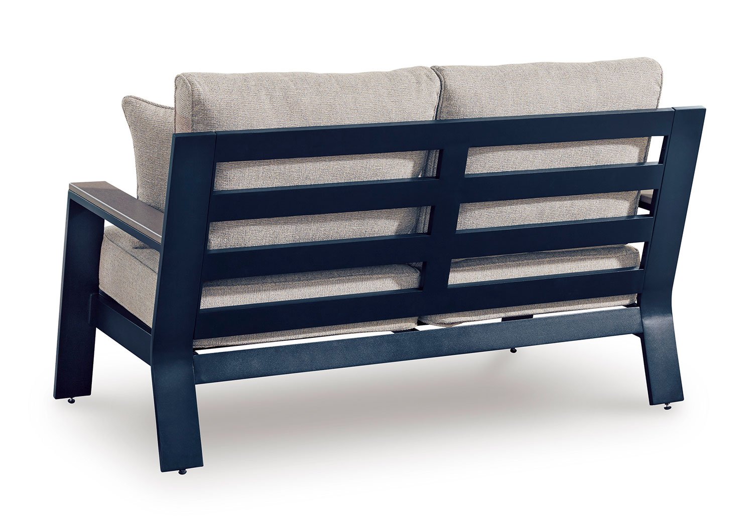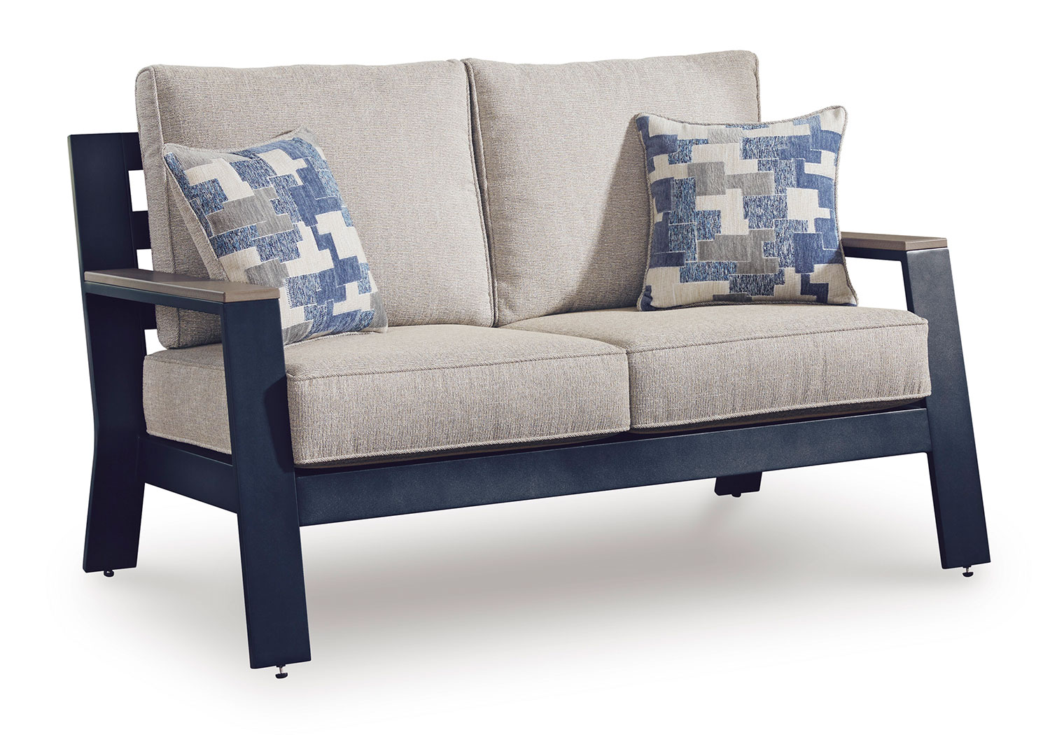 Easy-breezy beauty, made to withstand the elements. This outdoor loveseat makes a serene statement with its soothing shade of blue and contrasting wood-look arms. A cushioned seat and back keep you comfy as you lounge. Crafted with durable materials for added longevity, it’s a smartly stylish addition to your outdoor oasis.