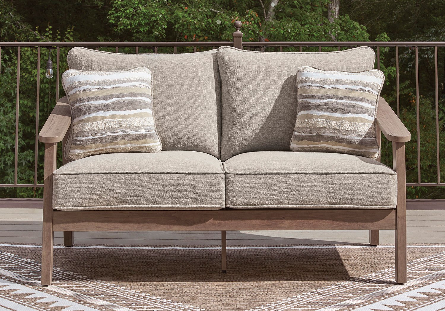 High style, meet sleek durability. This outdoor loveseat combines a contemporary silhouette with must-have longevity, so you can bring your eye for design alfresco. It impresses with the refined appeal of woven resin wicker and wood-look aluminum in a chic neutral color. And for easy cleanability and UV resistance, high-performing Nuvella® fabric covers the cushions.