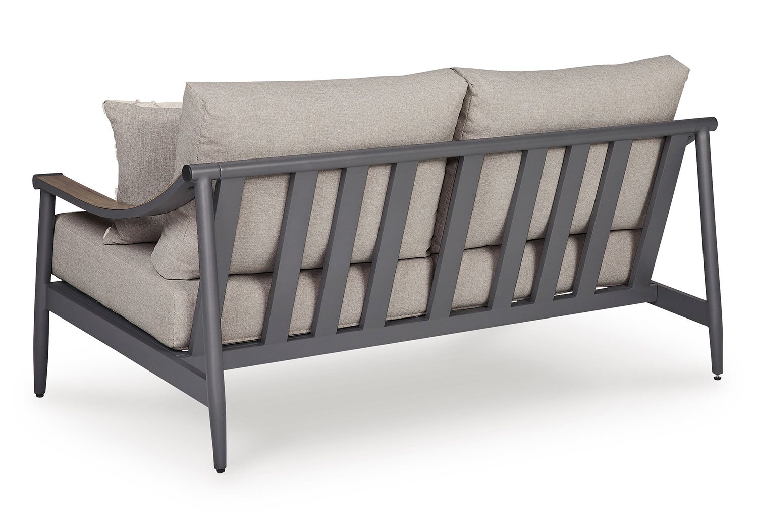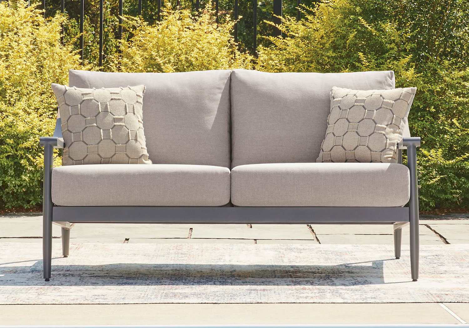 A refined marriage of style and durability, this outdoor loveseat adds contemporary flair to your porch or patio. Wood tones and shades of gray lend a versatile, neutral appeal. And this loveseat is built to last, thanks to its rust-resistant frame and cleanable, UV-resistant fabric.