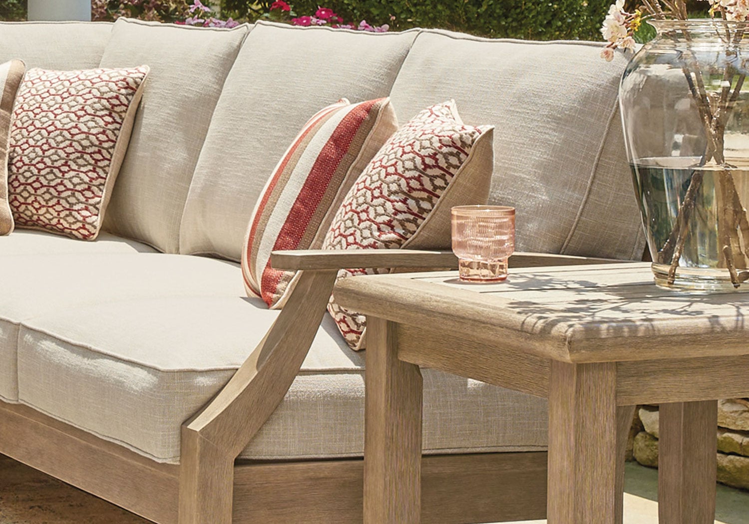 An effortlessly elegant choice in outdoor furniture, this sectional marries sturdiness and style in such a delightful way. Its eucalyptus wood frame, with tapered touches and slat styling, is treated to a 5-step finishing process for that much more weather protection. Sumptuously soft yet remarkably durable, the included cushions are wrapped in high-performing, low-maintenance Nuvella® fabric that you’re sure to love.