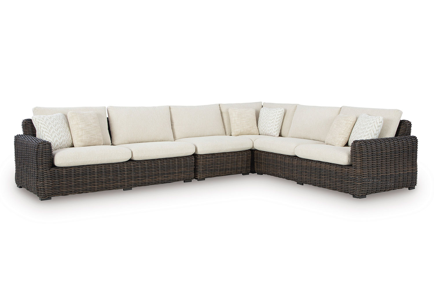 - Includes 4 pieces with cushions: outdoor left-arm facing loveseat, armless chair, corner chair and right-arm facing loveseat
