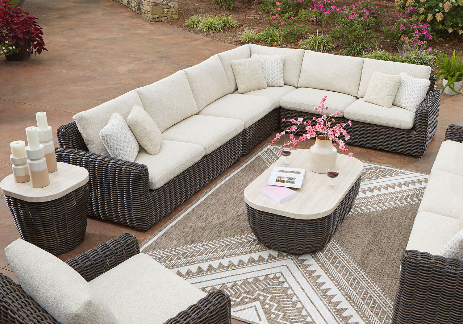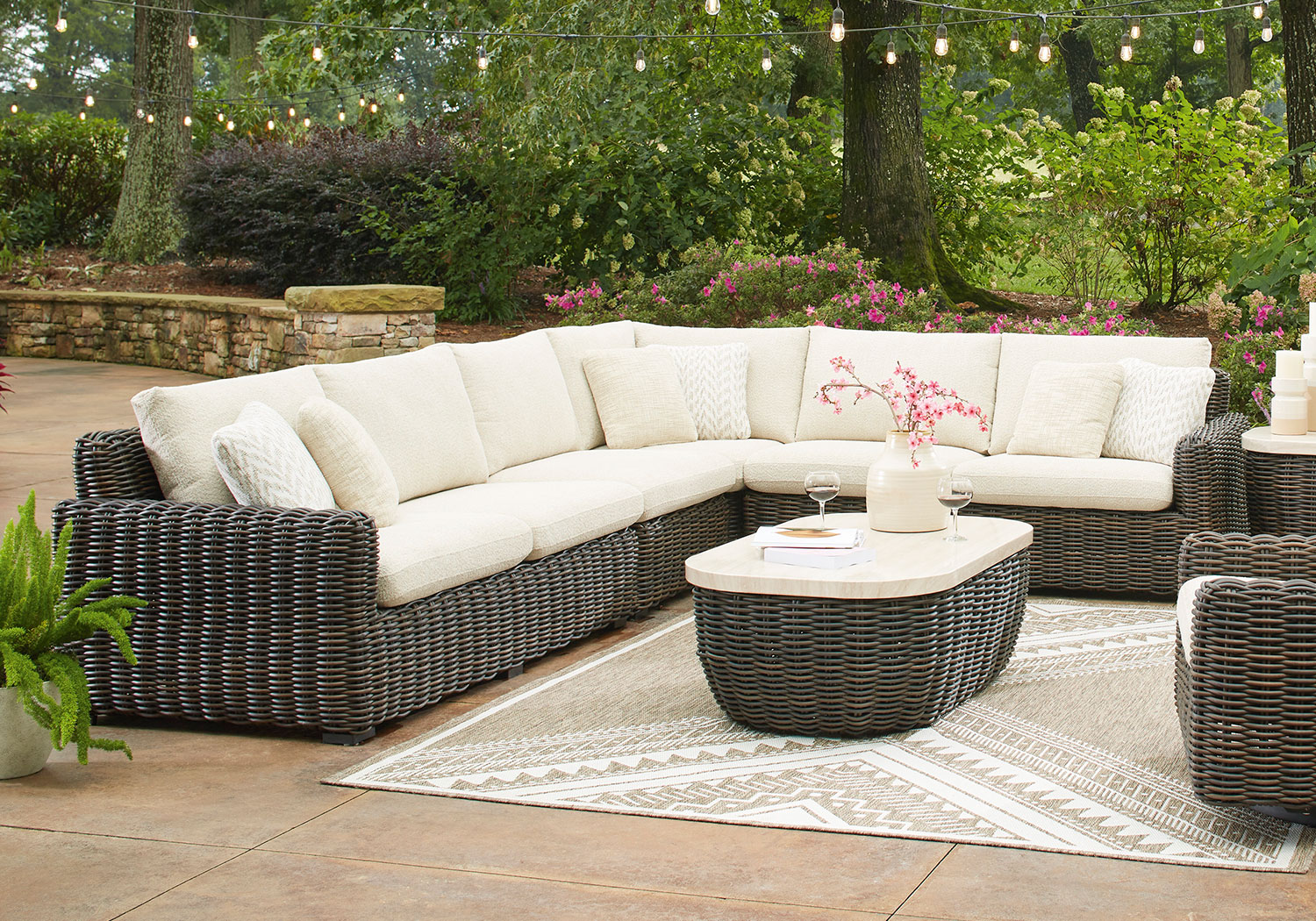 Add luxury, comfort and durability to alfresco fun. This outdoor sectional captures the textural beauty of wicker while withstanding the elements, from rain to shine. With a UV-resistant design, the wonderfully low-maintenance Nuvella+™ fabric maintains its good looks over time. Deep, roomy seating completes the piece, offering ample space to sprawl out.