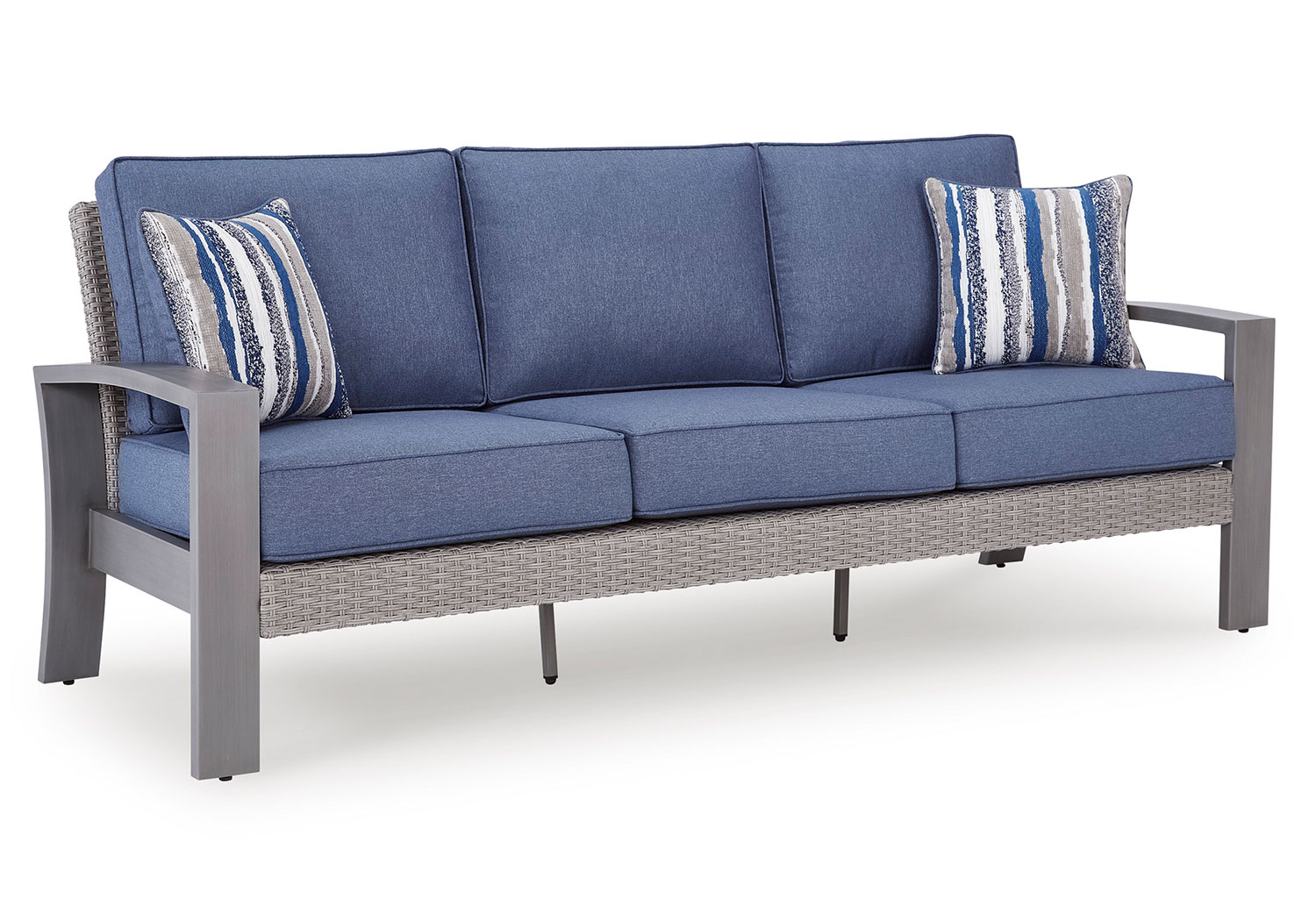 High style crafted for low-maintenance living. Turn your outdoor space into a sweet retreat with this sofa. The casually cool piece entices in an easy-breezy gray resin wicker over an all-weather aluminum frame, for an upscale aesthetic that’s downright durable. Its plush seat cushions, wrapped in high-performance Nuvella® fabric, are indulgently comfortable yet so easy to maintain. Accent pillows add delightful flair.
