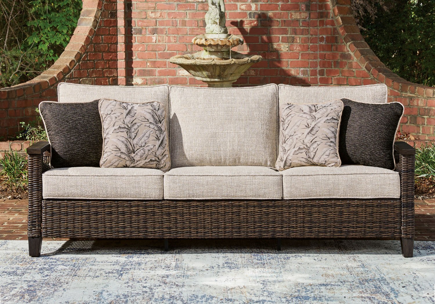 Looking for that special spot to relax and entertain on your deck or patio? Then you’ll love this outdoor sofa. With beautifully textured resin wicker over a sturdy aluminum frame, it brings so much style and warmth to your outdoor space. The thick, comfortable cushions are covered in cleanable, UV-resistant Nuvella® fabric, so you can spend less time worrying and more time chilling. What a smart and stylish way to create a beautiful, lasting space for everyone to enjoy.