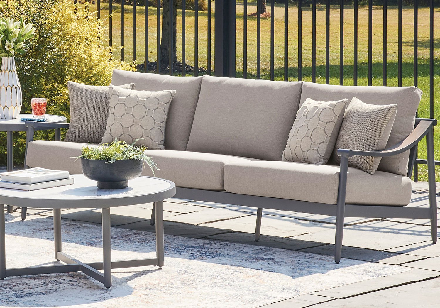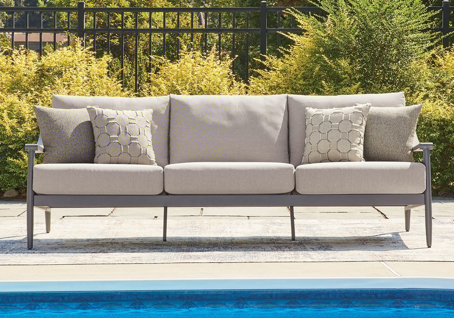 A refined marriage of style and durability, this outdoor sofa adds contemporary flair to your porch or patio. Wood tones and shades of gray lend a versatile, neutral appeal. And this sofa is built to last, thanks to its rust-resistant frame and cleanable, UV-resistant fabric.