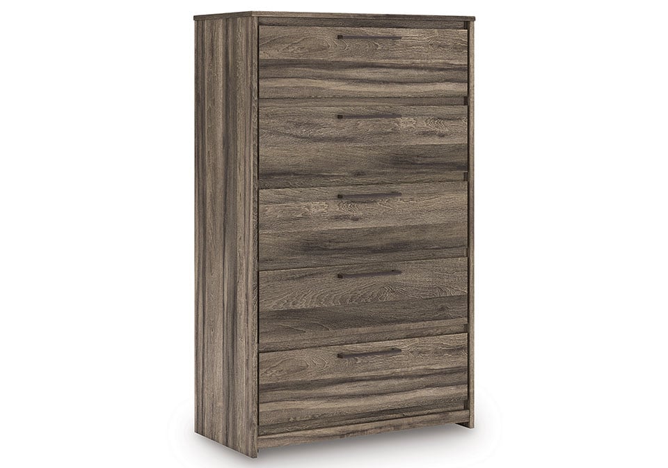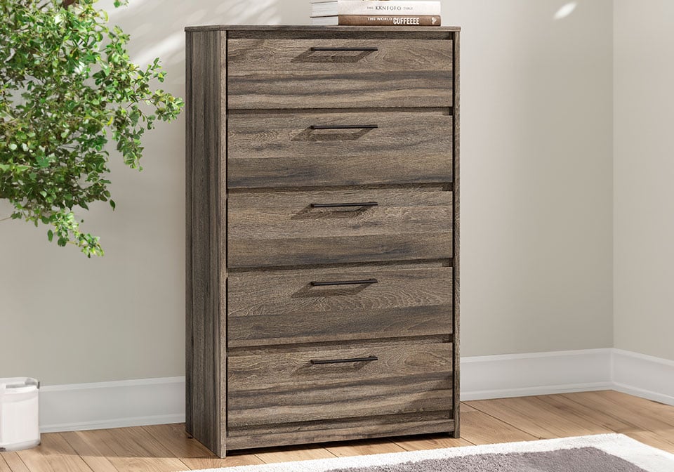 Rest in the casually cool style of this Panel Series. A weathered brown finish over replicated oak grain creates an easygoing vibe, setting the scene in your restful retreat. Clean lines and modern handles provide a fuss-free look.