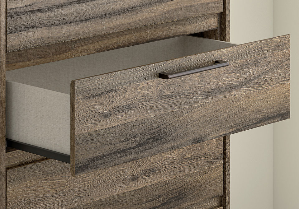 Made with engineered wood (MDF/particleboard/plywood) and decorative laminate for the right balance of affordability and durability. Weathered brown finish over replicated oak grain with authentic touch. Decorative laminate replicates natural or man-made material surfaces with consistent color, pattern and texture. Linear pulls with antiqued gunmetal finish. Drawer interiors are lined with a faux linen laminate for a clean, finished look. Drawers extend out to accommodate maximum access to drawer interior while maintaining safety