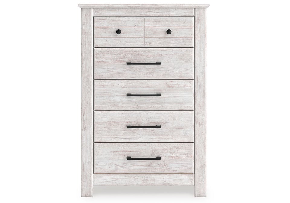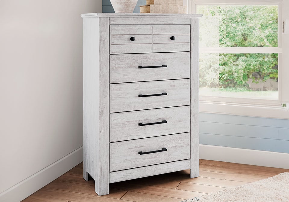 Looking to create a bedroom that feels airy and beautifully put together? This casually comfy chest of drawers is your perfect solution. Its clean lines, whitewash finish and replicated pine grain exude a charming cottage-inspired feel that brightens your restful retreat. Spacious drawers with dark bronze-tone knobs stow away clothes and more. Now there’s a fresh take on country living we can get behind.