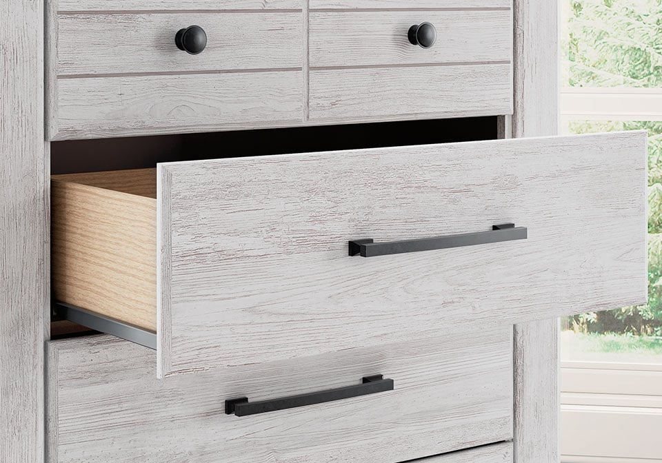 Made with engineered wood (MDF/particleboard/plywood) and decorative laminate for the right balance of affordability and durability. Whitewash replicated worn through paint over replicated wood grain with authentic touch. Decorative laminate replicates natural or man-made material surfaces with consistent color, pattern and texture. Hardware with dark bronze-tone finish. 5 smooth-gliding drawers. . Drawers extend out to accommodate maximum access to drawer interior while maintaining safety. Minor assembly required.