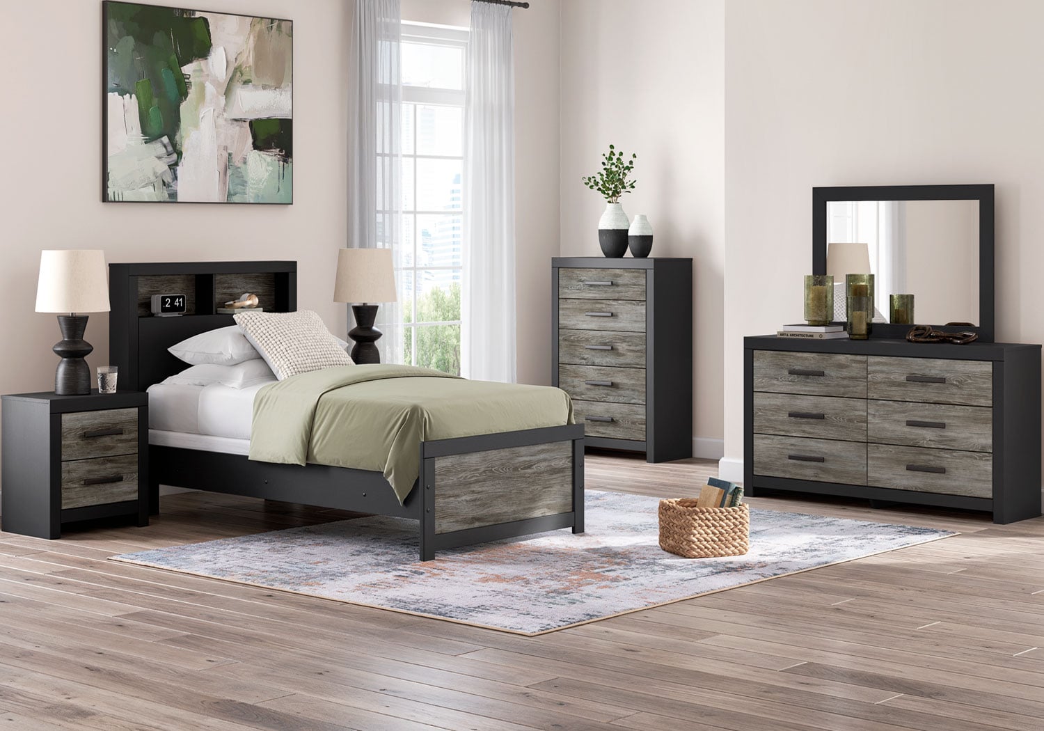 Comfy, functional and versatile, this bookcase Series evokes the tranquil vibe you long for in your dream destination. Its two-tone textured look marries a rustic gray finish and a matte black finish over replicated oak grain for neutral appeal. Three open cubbies in the headboard add space-saving storage, keeping favorite reads, bedtime essentials and so much more within easy reach.